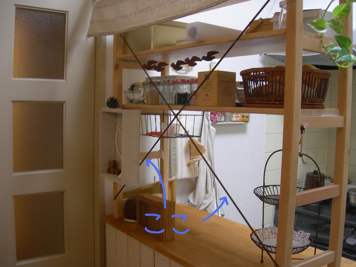 このカウンターの上の部分は、無印のパイン材ユニットシェルフなので
